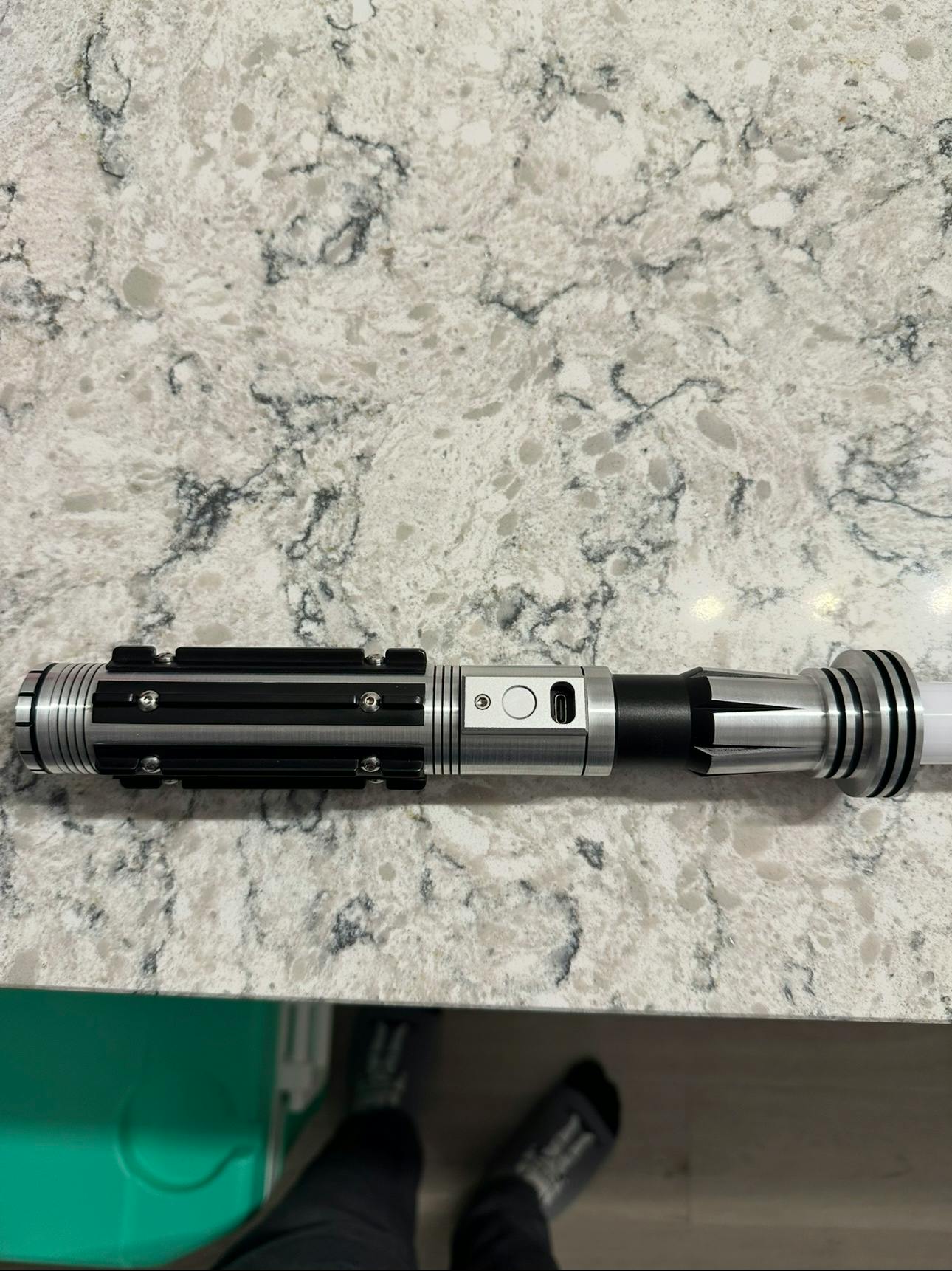 The Customizable Apprentice Saber uses a USB-C port. A USB-C to USB-A cable is provided with Eco Elite Sabers.